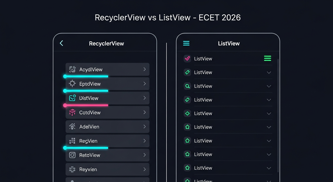 - ECET repeatedly asks questions about RecyclerView vs ListView, their architecture, and working principles.