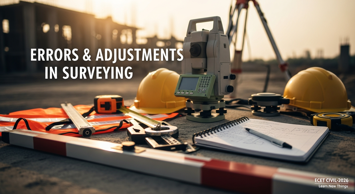 In surveying, measurements can never be perfect — every reading contains some degree of error. Understanding types of errors and how to adjust them is crucial for accuracy in civil engineering fieldwork and ECET exams.