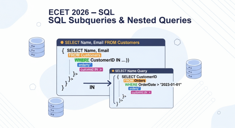 ECET 2026 CSE ECET 2026 CSE LearnNewThings October 4, 2025 0 Comments Day 55 – ECET 2026 Evening Section: DBMS – SQL Subqueries & Nested Queries In ECET 2026 DBMS, SQL Subqueries and Nested Queries are one of the most asked topics. These are easy to learn but scoring if you understand how queries work...